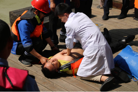 此次演練主要是模擬了乘坐游船過程中,突遇上游泄洪,導致水位上漲,流速加快,游船側翻,兩名游客落水。船岸安全員在第一時間發現事故后,立即上報碼頭現場負責人,由現場總指揮馬上安排工作人員駕駛救援艇帶領隨行2名安全員展開救援行動。同時,現場總指揮按照邊救援邊報告的原則,在接到事故信息后立即按組織程序上報工作領導小組組長,啟動應急救援預案,并聯系醫務人員到達現場準備施救工作。