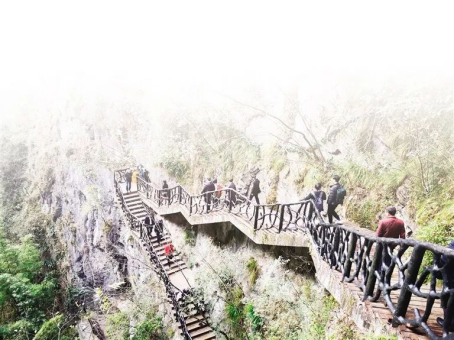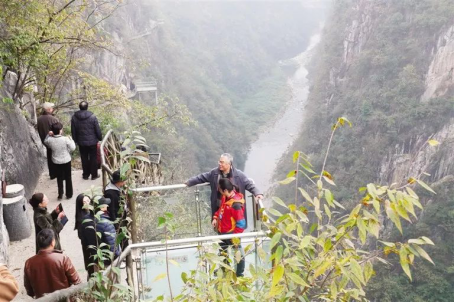 在蒲花暗河,采風(fēng)團(tuán)一行從山頂拾級(jí)而下,經(jīng)自然天成的赤穴溶洞,乘船穿越“三天兩夜”,感受天生橋和“蒼天有眼”的大自然鬼斧神工。