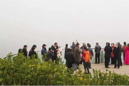 冬日的芭拉胡,晨霧繚繞,縹緲靈動(dòng),似一條綠色絲絳,將老城新城緊緊連在一起,繪就出一幅城景相融的水墨丹青。采風(fēng)團(tuán)的作家們來(lái)到這里,聽(tīng)回音、走玻璃棧道,漫步峽谷之間,親歷峽谷峽江的神秘和秀美。