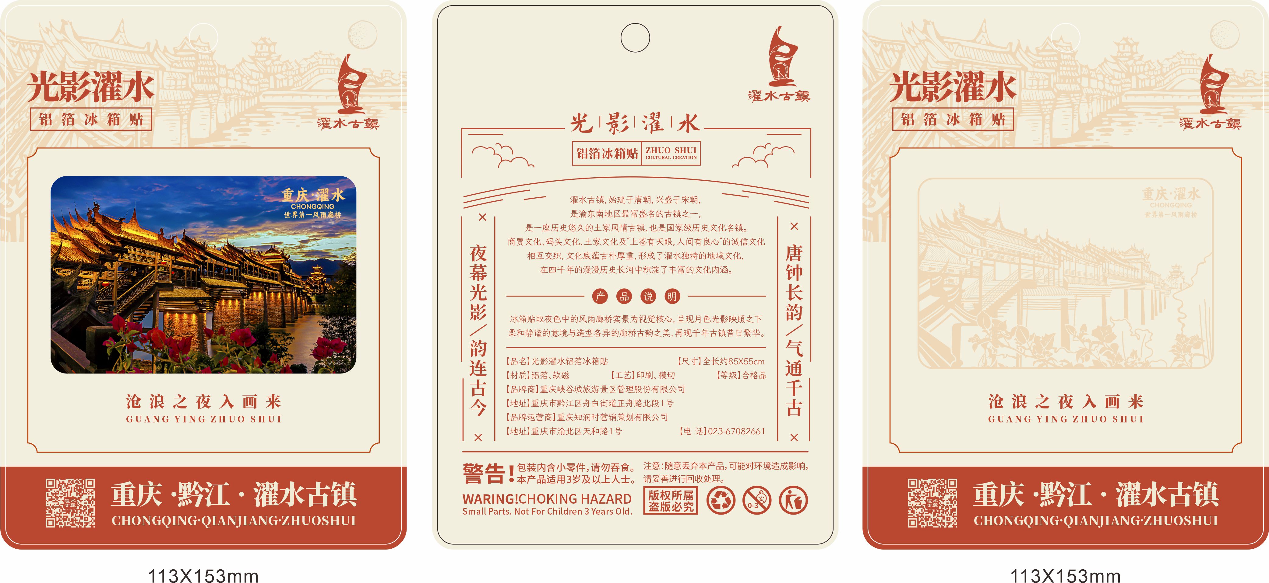 品名:光影濯水冰箱貼售價:15元產(chǎn)品說明:冰箱貼取夜色中的風(fēng)雨廊橋?qū)嵕盀橐曈X核心,呈現(xiàn)月色光影映照之下柔和靜謐的意境與造型各異的廊橋古韻之美,再現(xiàn)千年古鎮(zhèn)昔日繁華。銷售地址:重慶市黔江區(qū)濯水景區(qū)古鎮(zhèn)廊..